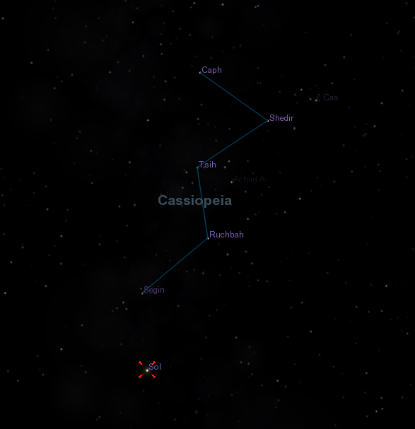 En la siguiente imagen generada por este programa, se puede contemplar cómo la ubicación de nuestro Sol quedaría muy próxima a las estrellas principales de la constelación de Casiopea.