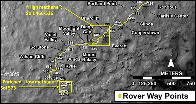En fechas más recientes, concretamente en el año 2014, el robot Curiosity detectó niveles bajos de este gas en el cráter Gale (154 km de diámetro) cerca de Elysium Planitia, pero sorprendentemente durante varios días marcianos del recorrido del robot a través del cráter, este detectó concentraciones elevadas de metano que han reabierto el debate sobre su misterioso origen. Estas fluctuaciones podrían guardar relación con determinadas condiciones climáticas estacionales, aunque hoy día sigue sin tener una explicación clara.