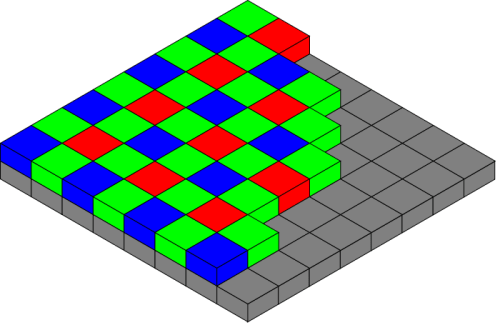 En una cámara digital convencional, el componente electrónico que recoge la luz y la convierte en señales eléctricas es el sensor, el cual se compone de millones de celdas fotosensibles. Lo más habitual en la mayoría de los sensores, es que por medio de filtros la luz se descomponga en luz roja, azul y verde. De este modo, existen celdas que solo recogen la luz correspondiente a la componente roja, otras solo la componente azul, y otras solo la verde. Finalmente, mediante un procedimiento de interpolación cromática se genera la imagen digital en color, con un pixel de luz obtenido a partir de cada cuatro celdas fotorreceptoras, y con menor resolución por tanto que una imagen monocroma obtenida sin aplicar el filtro de color (3).
