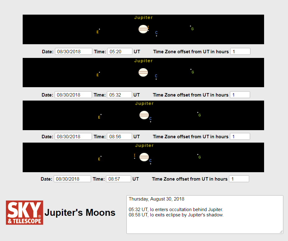 (4) Cuando la Tierra se aleja de Júpiter, Ío primero se oculta por detrás del disco del planeta y posteriormente emerge de la sombra que proyecta este gigante gaseoso. En el caso de que la Tierra se esté acercando a Júpiter, Ío es eclipsado por la sombra de Júpiter, para posteriormente aparecer por detrás del disco del planeta. Así mismo, hay que mencionar que cuando la Tierra se aleja de Júpiter, las ocultaciones de Júpiter se atrasan, mientras que cuando la Tierra se acerca a Júpiter, las ocultaciones de Ío se adelantan.