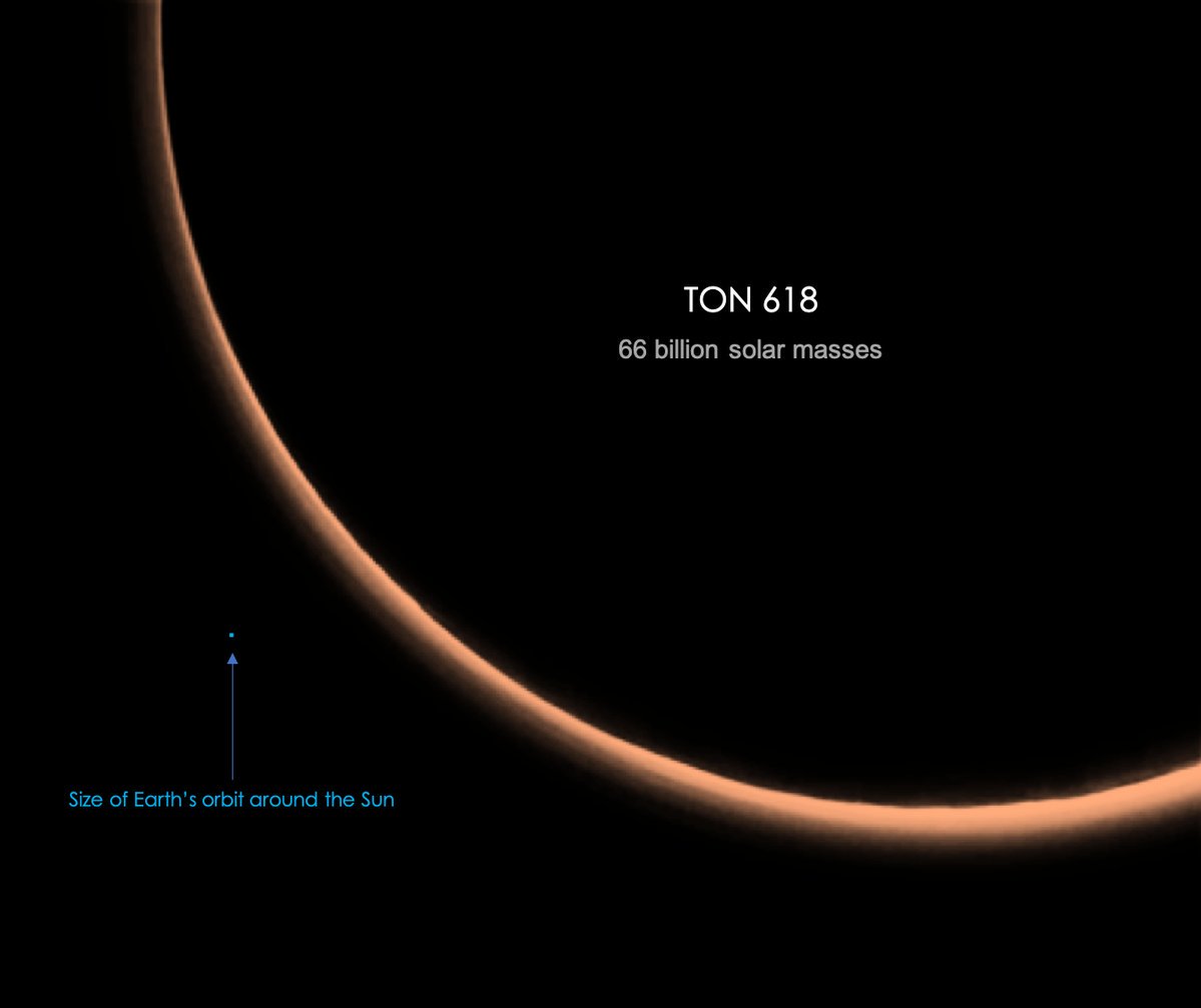 Un ejemplo de ello es el agujero negro supermasivo que se encuentra en el cuásar TON 618, el cual mantiene hasta el momento el privilegio de ser el agujero negro de mayor tamaño y masa de todos los agujeros negros conocidos. Su masa es de unos 66 mil millones de masas solares (2) y su diámetro de unas 2600 unidades astronómicas (UA) (3). Es decir 2600 veces la distancia entre el Sol y la Tierra. Pero no todo es descomunal en él, porque aunque no lo parezca, su densidad acorde a su masa estimada es muy inferior a la del agua. Esto es debido a que la densidad de un agujero negro es inversamente proporcional al cuadrado de su masa.